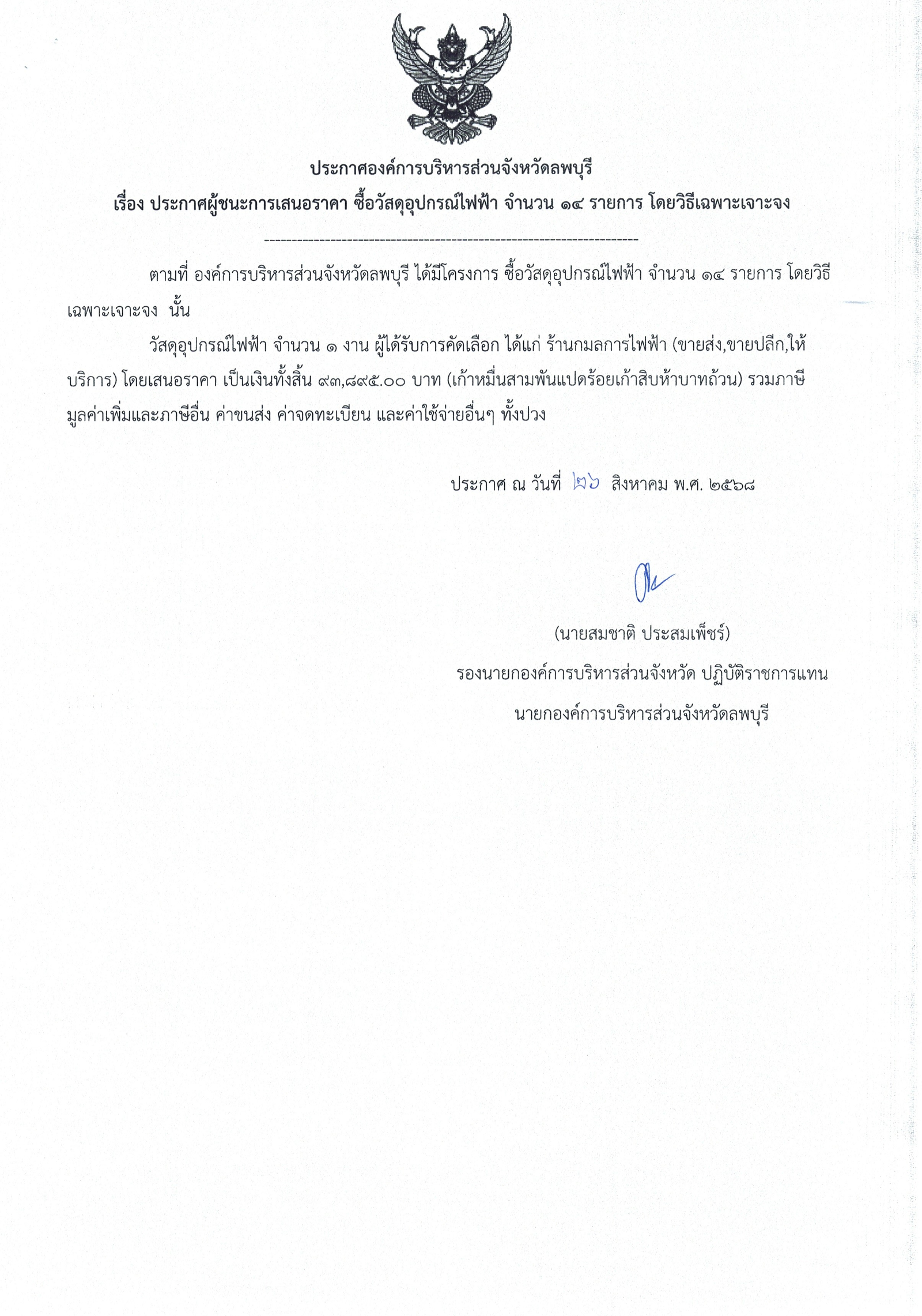 ประกาศผู้ชนะการเสนอราคา ซื้อกายอุปกรณ์สำหรับโครงการศูนย์ยืมกายอุปกรณ์และอุปกรณ์การแพทย์ องค์การบริหารส่วนจังหวัดลพบุรี ครั้งที่ 7/2568 โดยวิธีเฉพาะเจาะจง