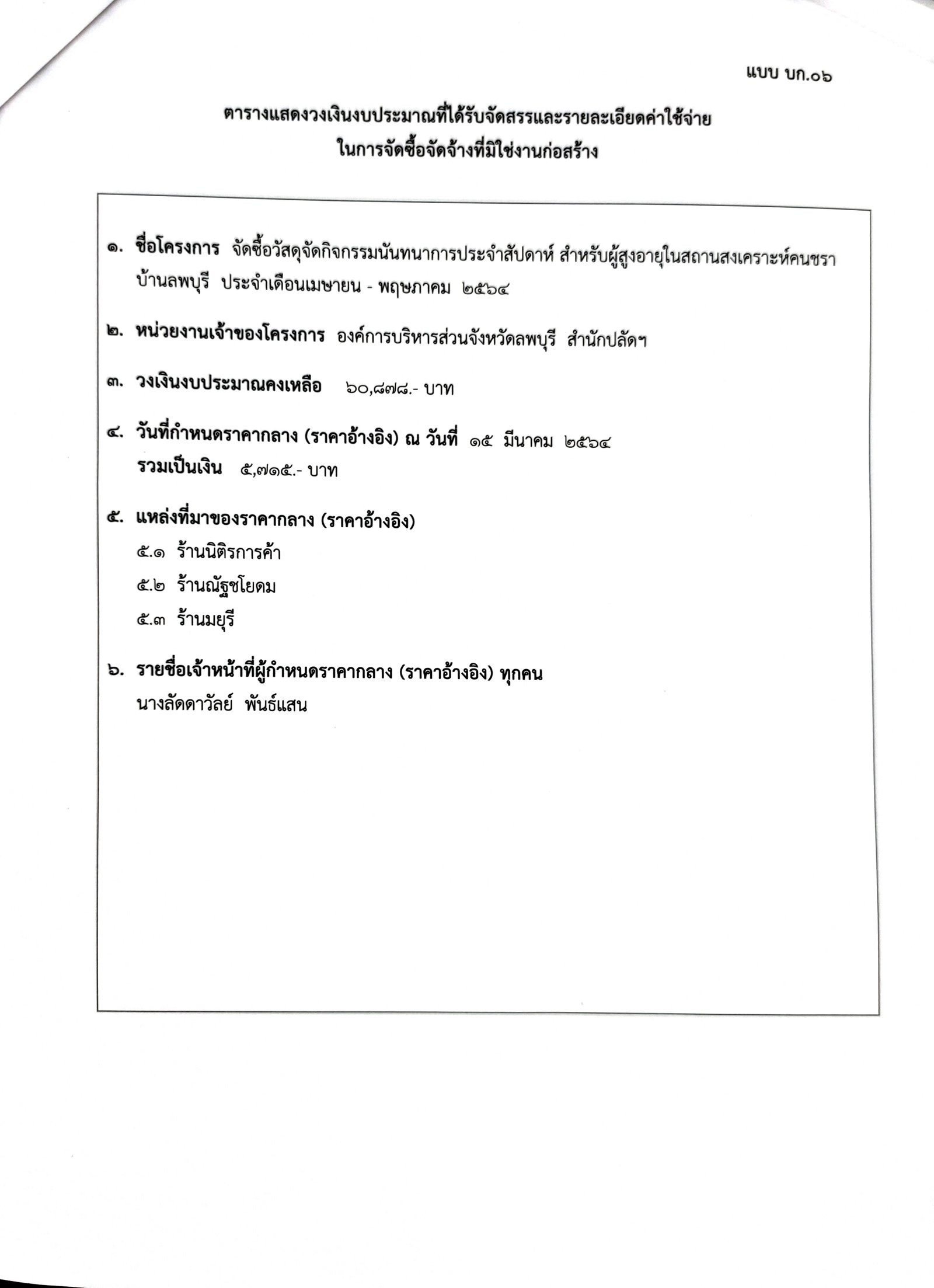 ราคากลางจัดซื้อวัสดุกิจกรรมนันทนาการประจำสัปดาห์ สำหรับผู้สูงอายุในสถานสงเคราะห์คนชราบ้านลพบุรี ประจำเดือนเมษายน-พฤษภาคม 2564